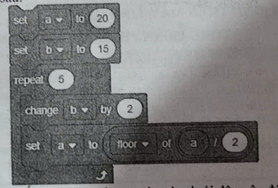Sau khi thực hiện khối lệnh trên, phương án nào dưới đây nêu đúng về giá trị lần lượt của a và b?